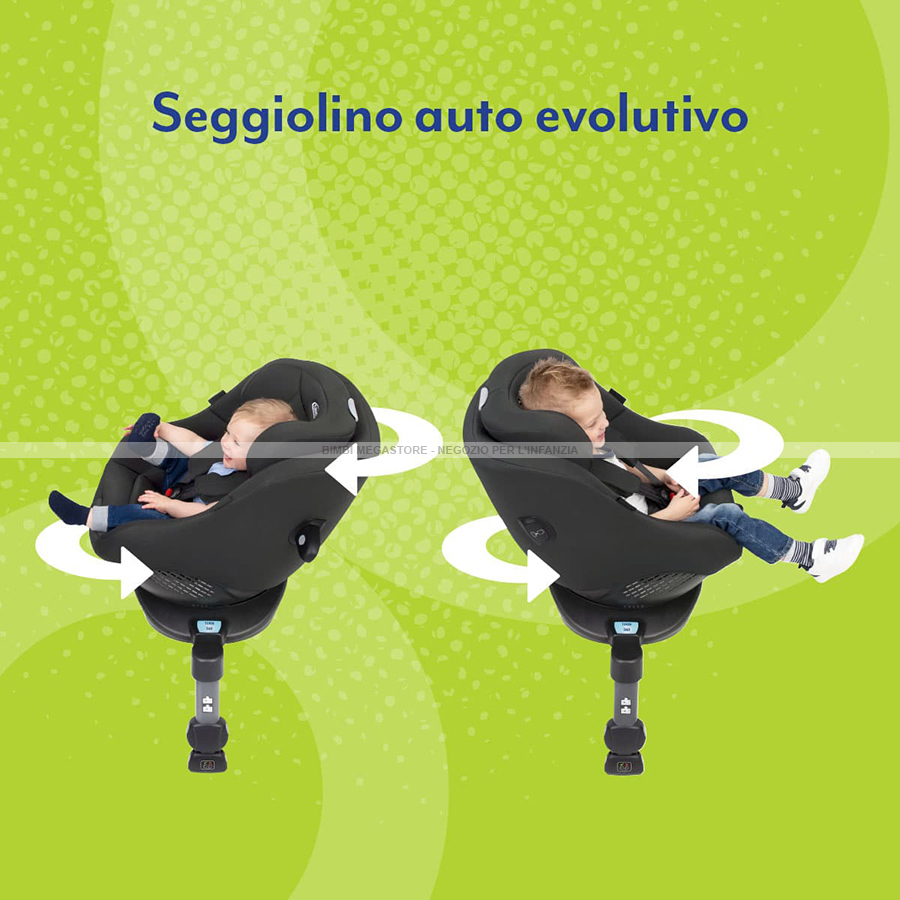 Il sistema di ancoraggio isofix e il piede di supporto anti rotazione garantiscono maggiore stabilità e soprattutto evitano errori di installazione. La seduta girevole a 360° e reclinabile in 5 posizioni, insieme all’inserto neonato, non solo regala comfort al piccolo, ma permette ai genitori di sistemarlo sul seggiolino semplicemente ruotando la seduta verso la portiera dell’auto.